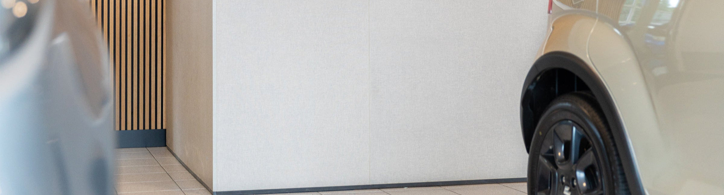 Bij Vakgarage Automeer is gekozen voor een strakke, functionele en representatieve ontvangstbalie die direct bij binnenkomst vertrouwen uitstraalt. De balie is bekleed met een verfijnde textielstructuur in een neutrale zandgrijze tint, wat zorgt voor een warme en professionele uitstraling. De achterwand van houten latten in verticale belijning geeft de ruimte ritme en een eigentijdse look, terwijl het lichte werkblad een frisse en toegankelijke indruk achterlaat. Door het gebruik van duurzame materialen en een minimalistisch ontwerp sluit de balie perfect aan bij het moderne karakter van de showroom. Deze op maat gemaakte ontvangstoplossing is in nauwe samenwerking met ons team ontwikkeld voor een optimaal functioneel én visueel resultaat.