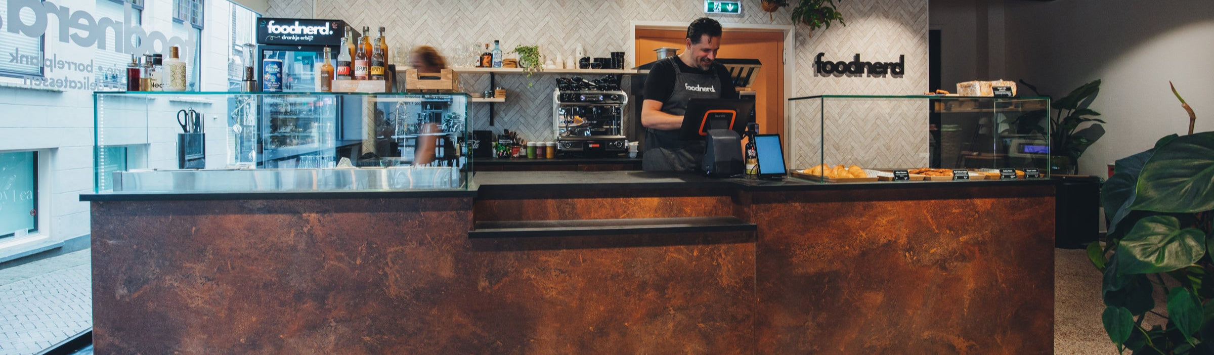 Voor Foodnerd in Dordrecht realiseerden we een interieur dat stoer, functioneel en uitnodigend aanvoelt – precies zoals de zaak zelf. Met een krachtige mix van materialen hebben we een warme, eigentijdse sfeer neergezet die aansluit bij het ambachtelijke karakter van de formule. De toonbanken en barmeubels zijn strak vormgegeven en afgewerkt met een robuuste roestbruine ombouw in cortenstaal-look, wat direct karakter en diepte geeft aan de ruimte. Greeploze fronten en een zwart binnenwerk zorgen voor rust en professionaliteit. De koeltoonbank is fris en helder vormgegeven, met een combinatie van RVS, witgelakte fronten en glas voor een verzorgde presentatie. Vrijstaande meubels met houten schappen en stalen frames brengen balans en warmte in het geheel. Zo ontstaat een krachtig totaalbeeld waarin uitstraling en gebruiksgemak naadloos samenkomen.