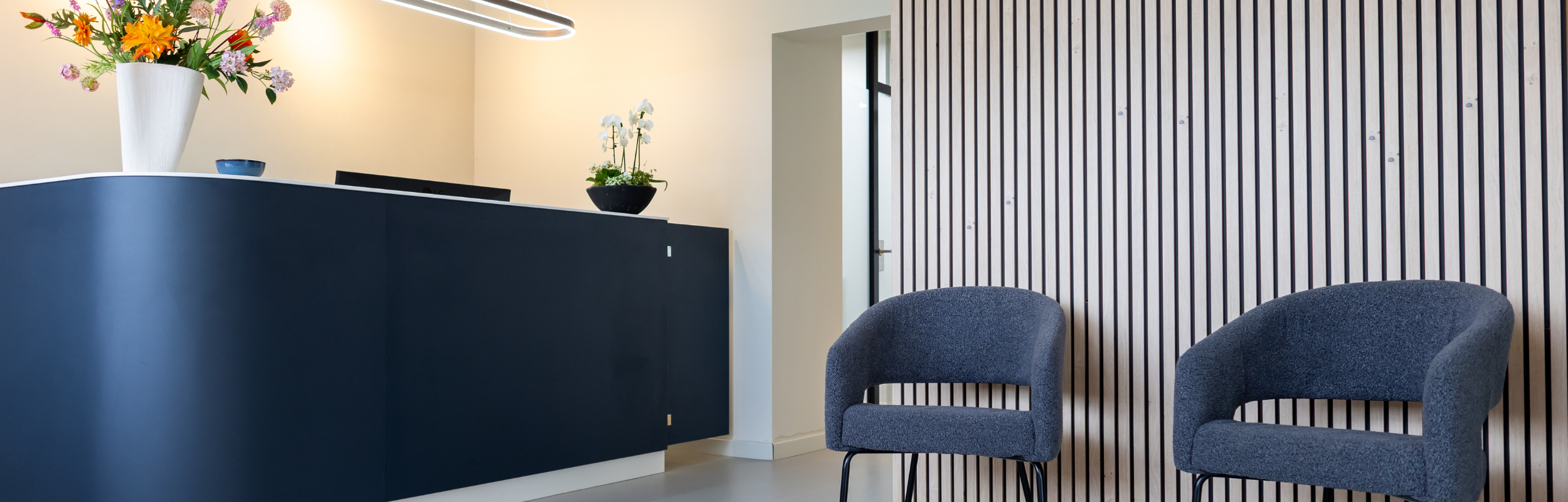 Het spel van zachte rondingen en strakke lijnen zorgt voor een uitnodigend geheel dat perfect aansluit bij de huiselijke sfeer van de praktijk.